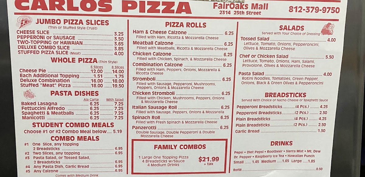 Welcome to Carlos Pizza Columbus, a beloved fixture in the heart of Columbus, Indiana. Over the years, this charming pizzeria has earned a loyal customer base, with patrons praising both the immense slices and the warm, friendly service. Located at 2314 25th St, Carlos Pizza stands out with its fantastic menu offerings.